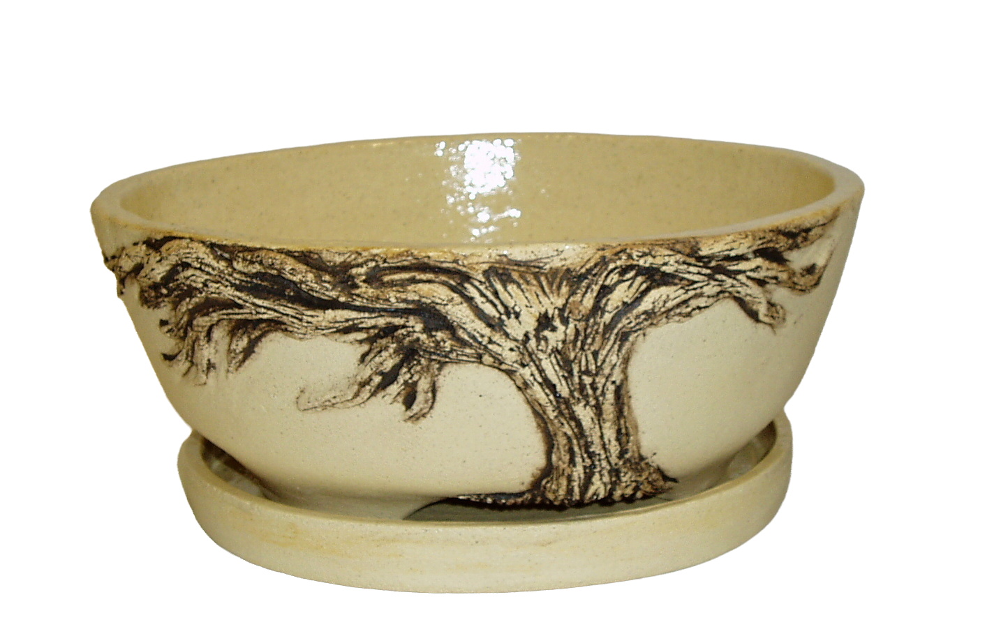 Oryginalna ceramiczna, mrozoodporna doniczka do bonsai o średnicy 19 cm z podstawką. Wysokość bez podstawki 9 cm.